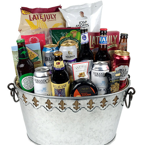 Beer lovers basket packed with unique beers and snacks that any gourmand would love. Cheese, crackers, nuts, the whole kitchen sink included to enjoy with your cold beer. Comes in a silver tub that can be used as an ice bucket and keep for other uses in the future.