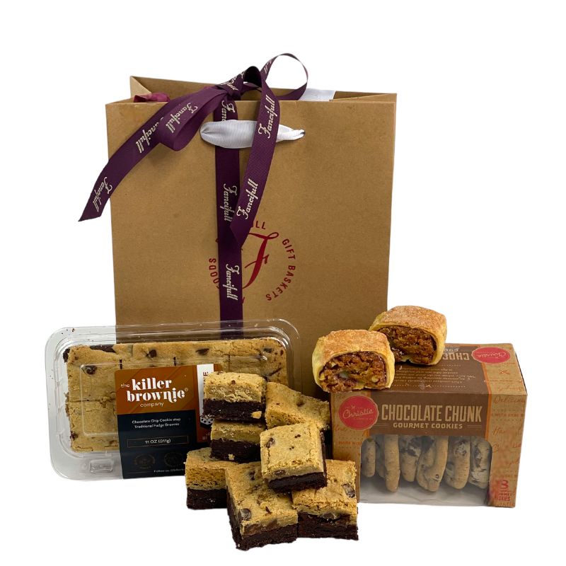 The photo says it all: Killer Brownies which are actually a Brookie - brownie with chocolate chip cookie on top, Christy's Cookies and two piece Rugalasch. It also happens to be Kosher, as as well as incredible good. Make someone or a small group very happy, send this gift. A nice little something to thank a friend when more than a thank you card is desired