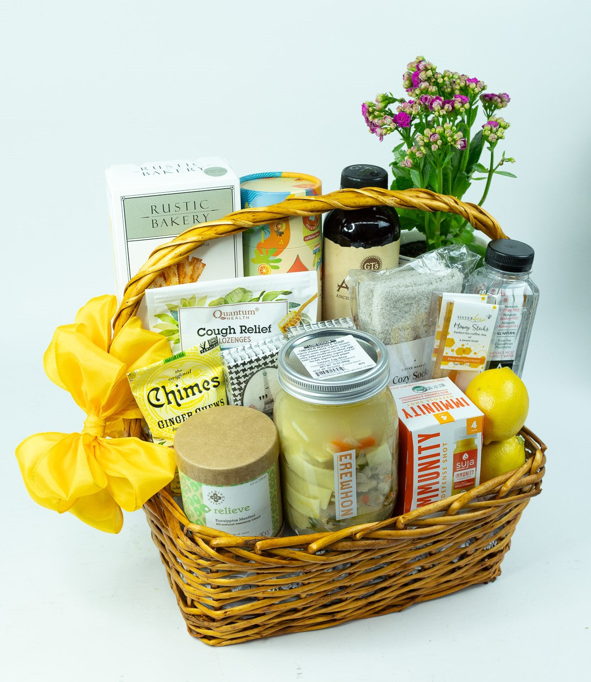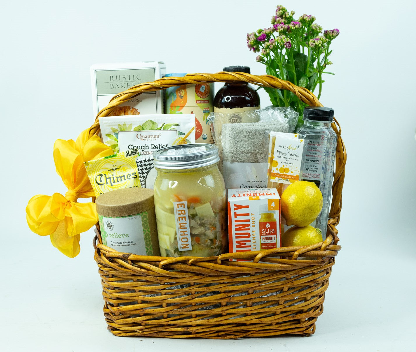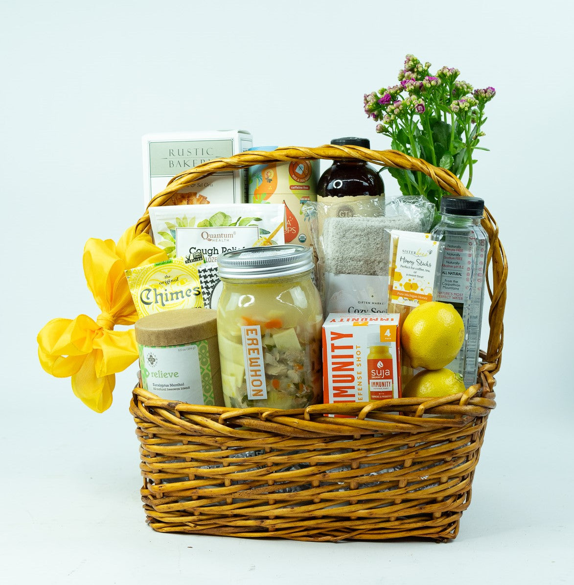 A bountiful jar of Erewhon's chicken soup with everything you need to feel better! Immunity boost shots, fresh lemon, tissue, water, candle, ginger drops, cough drops, cozy socks, a plant or flowers, mushroom elixir, crackers, tea and honey sticks. When you can't be there to take care of that special someone, send them this gift so that they have everything they need!