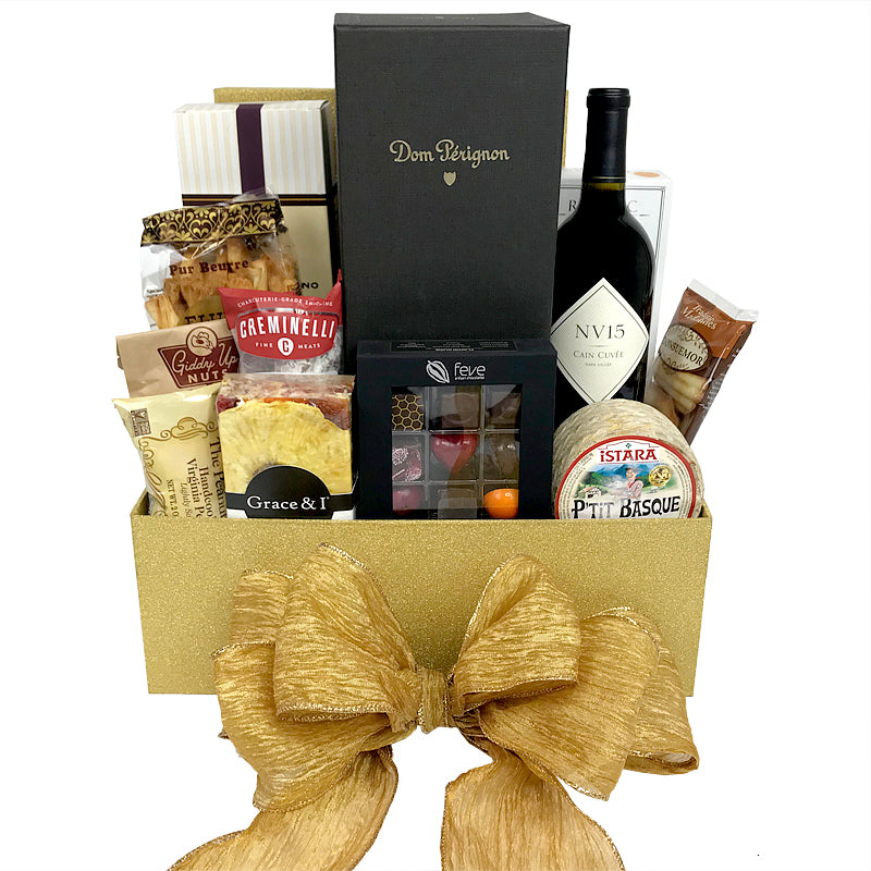 Presented in a gold sparkly box, Dom Perignon is the centerpiece with Cain Cuvee Napa Bordeaux Blend standing by his side. They are supported by a mini wheel of Ptit Basque Sheep Milk Cheese, Rustic Bakery Flatbread, DiCamillo Wine Biscuits, Creminelli Sopressata, Giddy Up Nuts Coco and Coffee Almonds, Flufa Cheese Puff Pastry Twists, Cashews, Grace and I Fruit and Nut Loaf, Madelaines and the incomparable Feve Chocolate Assortment.