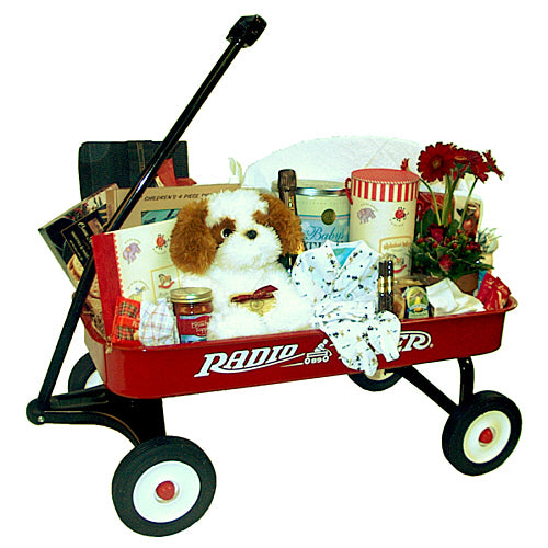 The new parents will be thrilled with this spectacular gift: the 34 inch Steel Radio Flyer red wagon filled with all of baby's essentials: deluxe cotton blanket, baby outfit, large lovable plush stuffed animal, hooded baby towel, soft washcloth, booties, picture frame, champagne, chocolates and much more.