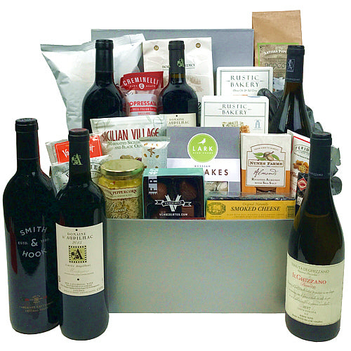Three wines: An Italian White, a French and California Red in our handsome grey box. It is filled with equally impressive foods. The artisan food is sure to please: Smoked Cheese, Marinated Sicillian Olives, V Chocolate Truffles, Dark Chocolate Bar, Creminelli Sopressata, Sourdough Flatbread, Santa Barbara Sea Salt & Olive Oil Popcorn, Feta Pepper Spread, Lark Tea Cakes, Vacaville Nut and Fruit Mix, Jose Andres Olive Oil Chips with Pink Himalayan Salt, Borgo di Medici Chocolate Star Cookies, Nunes Almonds, 5 O'Clock Crunch Snack Mix, V Chocolate Peanut Butter Bar, Rustic Bakery Blue Cheese Coins, Feridies Peanuts. Impressive.